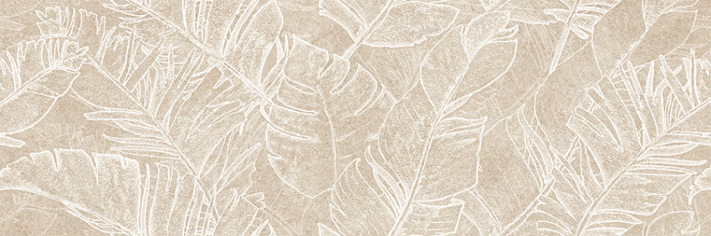 Коллекция матовой настенной плитки Garden в формате 300x900 мм представляет собой сочетание рельефной текстуры камня и тропических листьев. Теплая цветовая палитра коллекции выполнена в бежевых оттенках. Оригинальный декоративный массив с растительным узором листьев имеет многослойные градиенты и тени, за счет чего рисунок кажется живым и объемным. Флористичный узор продолжается на каждой плитке, создавая непрерывный рисунок. Дополнена серия рельефной плиткой с деревянной текстурой, она гармонично сочетается с бежевыми оттенками, расставляя акценты и выделяя функциональные зоны помещения. Плитки имеют ректифицированный край, что позволяет осуществить укладку с минимальным швом. В состав коллекции входит золотой бордюр, ректифицированный керамогранит в формате 600x600 мм, керамогранит с текстурой дерева в формате 200x900 мм. Такая коллекция станет универсальным фоном для современного уютного интерьера.